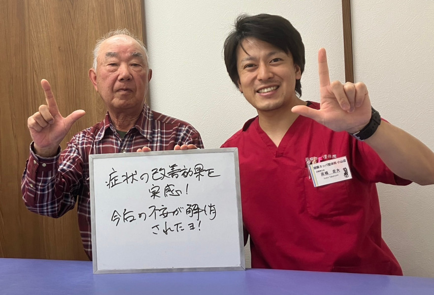 Q、あなたと同じような症状でお悩みの皆様へメッセージがありましたら教えてください。 A、身体全体の硬さがほぐれ、姿勢が良くなってきたと妻が言っております。私自身も若くなってきたと感じております。